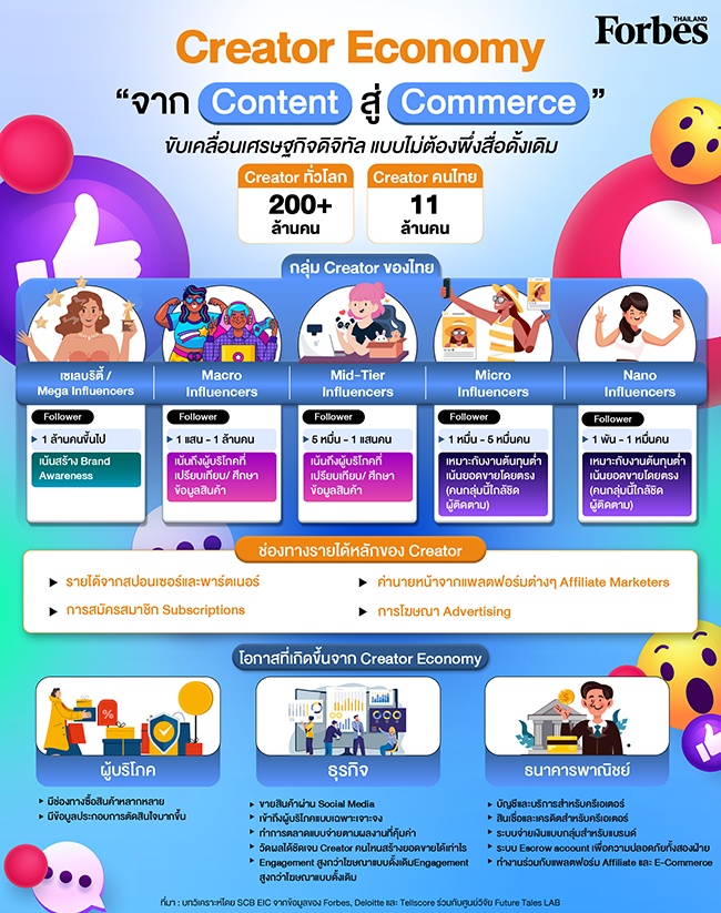 หมายเหตุ : เรียบเรียงเนื้อหาโดยใช้ข้อมูลจากบทวิเคราะห์ของ SCB EIC เรื่อง “จาก Content สู่ Commerce” Creator economy สร้างรายได้ สร้างยอดขาย สร้างระบบ