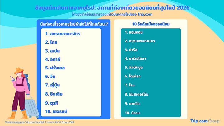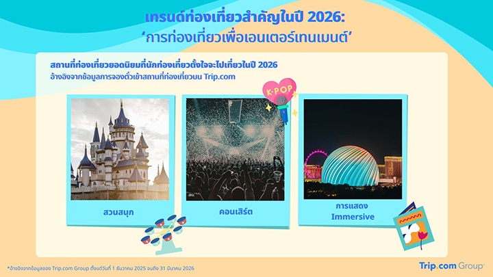 Trip.com Group เปิดเทรนด์การท่องเที่ยวปี 2569 เที่ยวไทยยังฮอต ติด Top 3 จุดหมายปลายทางยอดนิยม ส่วนจีน-ตุรกีมาแรง นักท่องเที่ยวแห่ตามรอยสวนสนุก คอนเสิร์ต และเทศกาลดนตรี